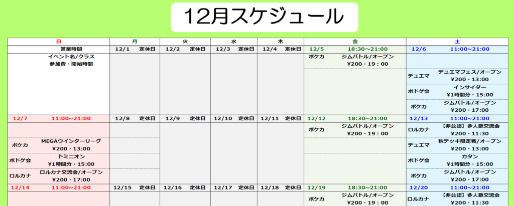 お知らせ2025年12月6日12月営業予定のお知らせ~イベントのお知らせと新ボードゲーム~